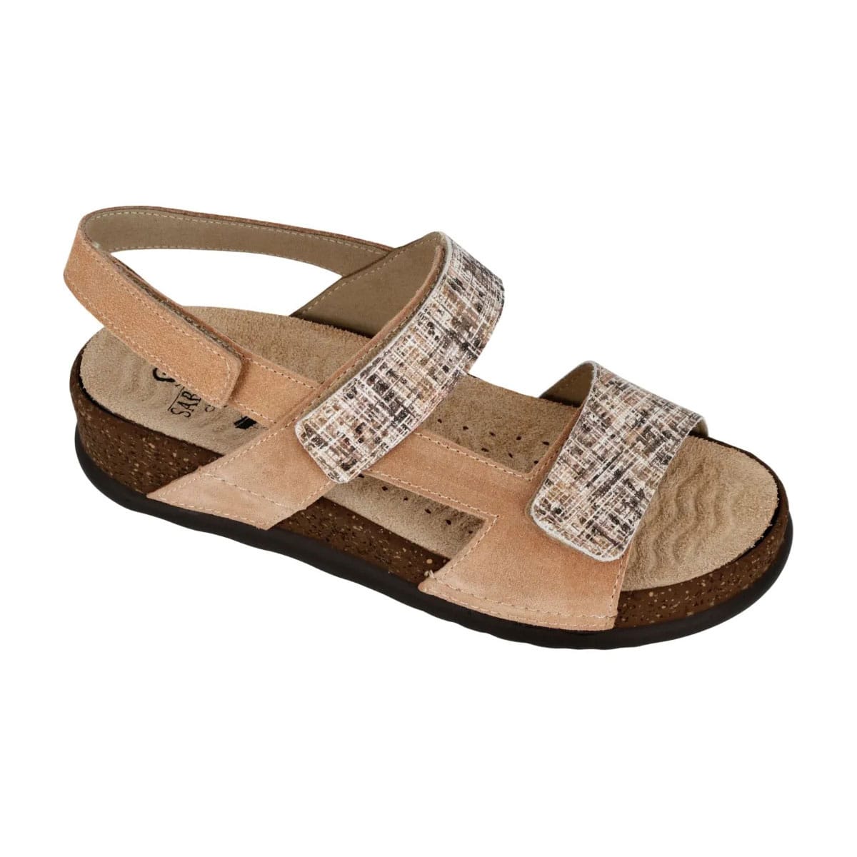Sandalo in pelle realizzato con materiali di altissima qualità che assicurano morbidezza e comfort assoluto. La tomaia avvolge molto bene il piede garantendo stabilità e le due fasce con velcro permettono una regolazione ottimale. I pellami usati sono di due tipi, il classico camoscio e il tweed, una pelle lavorata a formare piccole righe di vari colori tono su tono che dona luminosità e arricchisce lo stile.